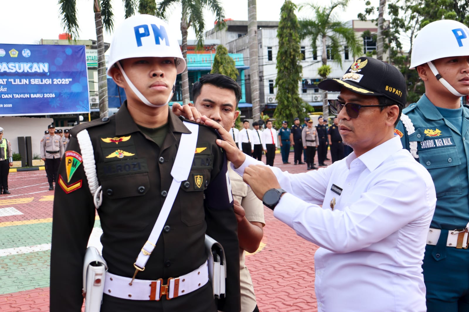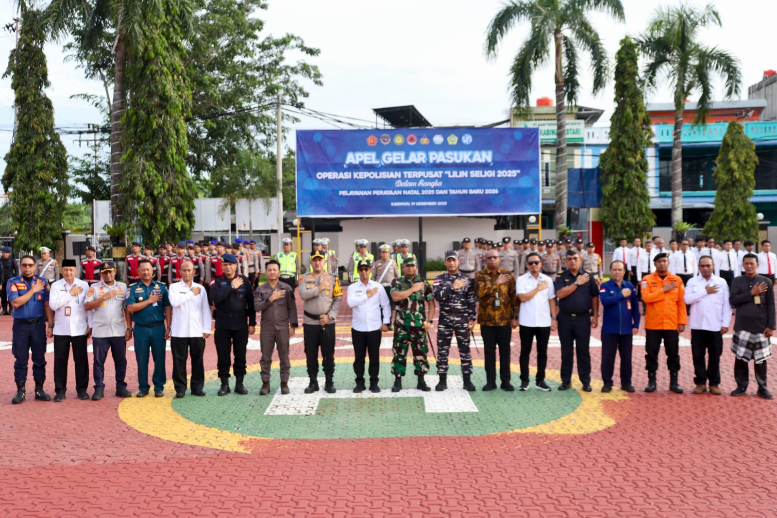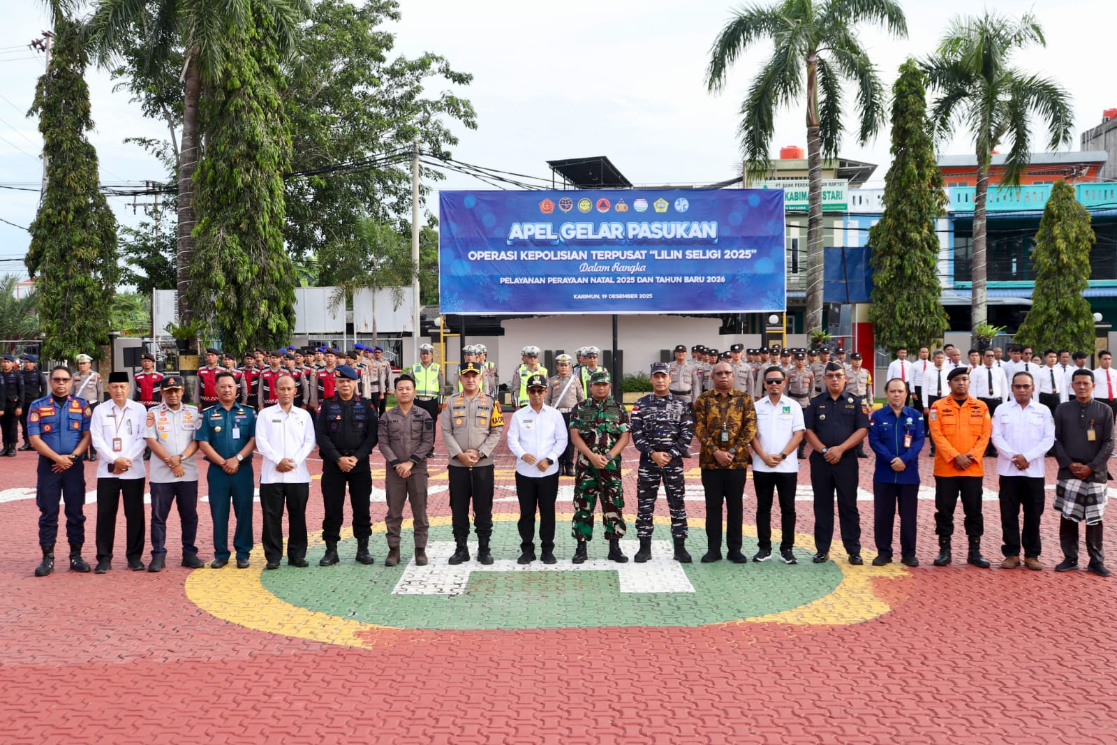 Karimun – Apel Gelar Pasukan Operasi Lilin Seligi 2025 digelar di Lapangan Bhayangkara Polres Karimun, Jumat (19/12/2025) sore. Apel dipimpin oleh Bupati Karimun Ing. H. Iskandarsyah dan dihadiri unsur Forkopimda, termasuk Dandim 0317/TBK Letkol Inf Andit Franata, S.I.P., serta instansi terkait.
