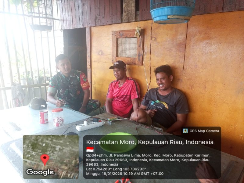 Moro – Babinsa Desa Keban Koramil 02/Moro Kodim 0317/TBK, Praka Randi Agus Satria, melaksanakan kegiatan Komunikasi Sosial (Komsos) bersama nelayan di wilayah binaannya pada Minggu (18/01/2026) sekitar pukul 10.10 WIB.