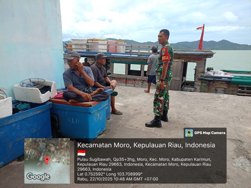 Karimun, 22 Oktober 2025 — Dalam rangka mempererat hubungan dan menjalin komunikasi sosial (Komsos) dengan masyarakat di wilayah binaan, Babinsa Desa Rawa Jaya Koramil 02/Moro Kodim 0317/TBK Praka Irvan Frasstyo melaksanakan kegiatan Komsos dengan warga yang berada di kawasan Pelabuhan Pasar, Kelurahan Moro, Kecamatan Moro, Kabupaten Karimun.