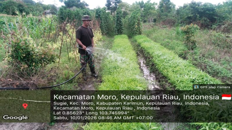 Moro – Babinsa Desa Sugie Koramil 02/Moro Kodim 0317/Tanjung Balai Karimun, Serma M. Amin, melaksanakan kegiatan perawatan tanaman sayuran kangkung di demplot Koramil 02/Moro, Kampung Wonorejo Dusun 01 RT 03/RW 02, Desa Sugie, Kecamatan Sugie, Sabtu (10/1/2026).