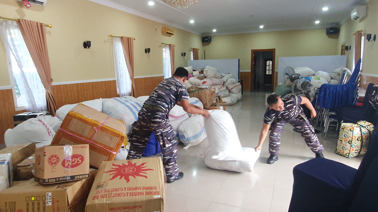 Adapun bantuan logistik yang disalurkan meliputi beras sebanyak 2,355 ton, 384 kardus mi instan, 288 kaleng sarden, 96 kaleng susu, 9 kardus minyak goreng, 6 kardus biskuit, 4 karung gula pasir, serta 178 karung pakaian layak pakai, dan berbagai kebutuhan pokok lainnya.