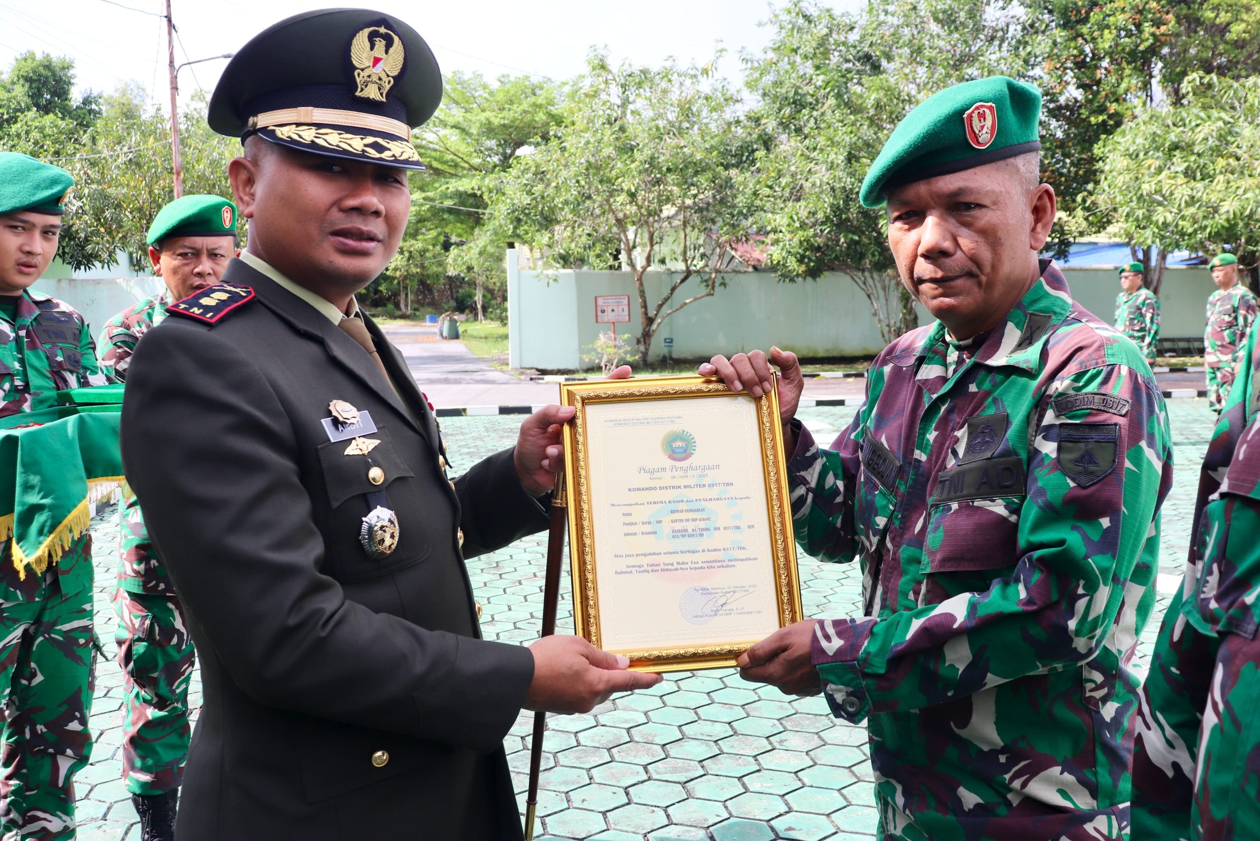 “Atas nama pribadi, keluarga besar Kodim 0317/TBK, dan seluruh jajaran, saya menyampaikan rasa hormat dan penghargaan yang setinggi-tingginya kepada Kapten Inf Ridwan Nainggolan. Beliau adalah salah satu perwira terbaik yang telah memberi teladan dalam pengabdian,” tambahnya.