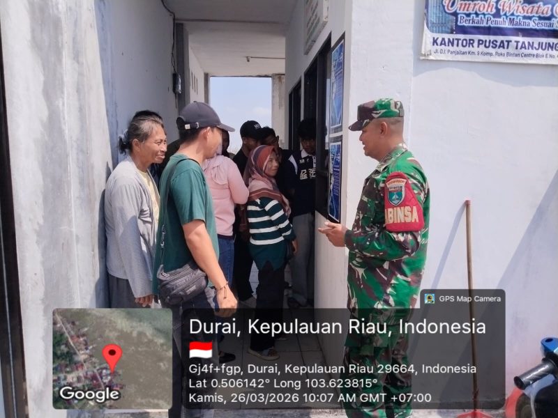 Moro, 26 Maret 2026 – Pelda Erdianto, Babinsa Desa Telaga Tujuh, Danpos Durai Koramil 02/Moro Kodim 0317/TBK, melaksanakan komsos dengan masyarakat Durai yang akan ke pulau, Kamis (26/3).