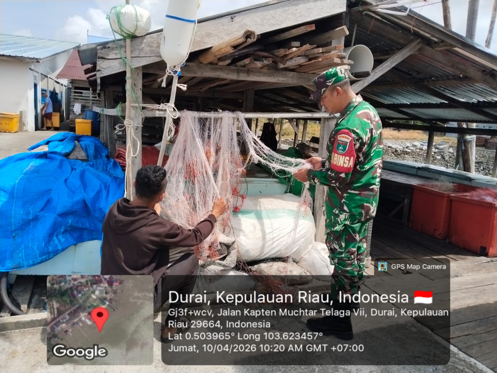 Karimun, 10 April 2026 – Pelda Erdianto, Danpos Durai Koramil 02/Moro Kodim 0317/TBK, melakukan Komsos dengan nelayan di Desa Telaga Tujuh, Jumat (10/4).