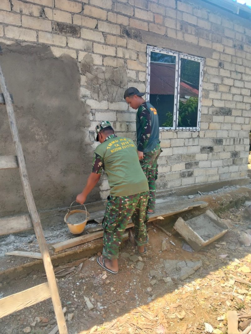 Dua personel Satgas, Kopka Antoni Siahaan dan Kopda F. Sihombing, bersama warga setempat terlihat bahu membahu melaksanakan pekerjaan plester dinding rumah yang berukuran 6 meter x 5 meter tersebut.
