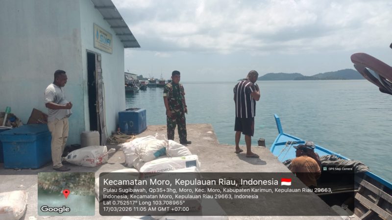 Karimun, 17 Maret 2026 – Serda Benny M, Babinsa Kel. Moro Timur Koramil 02/Moro Kodim 0317/TBK, melaksanakan komsos dengan pekerja pelabuhan di Pelabuhan Pasar Rakyat Kec. Moro, Selasa (17/3).